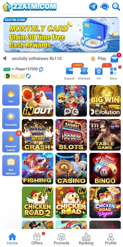 22ATM Game is an online gaming app where users can play different games and earn real money.